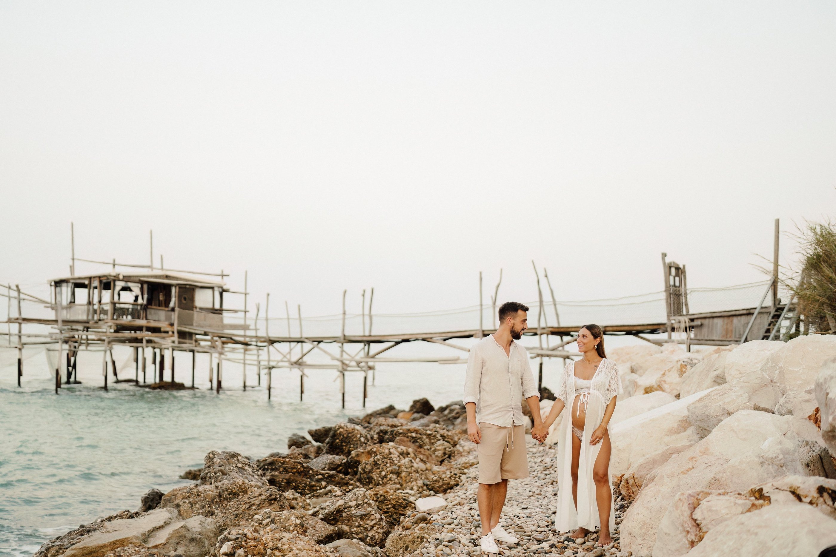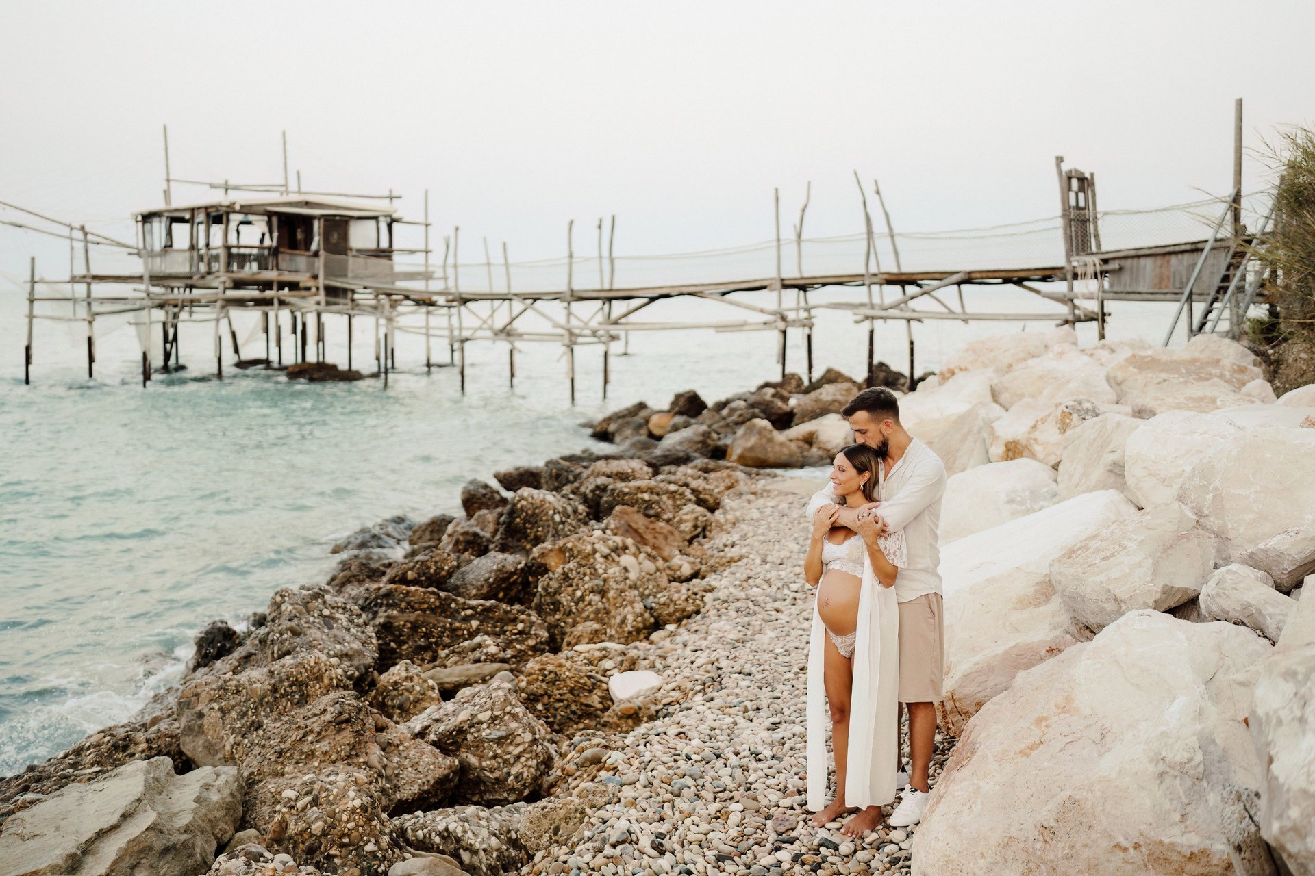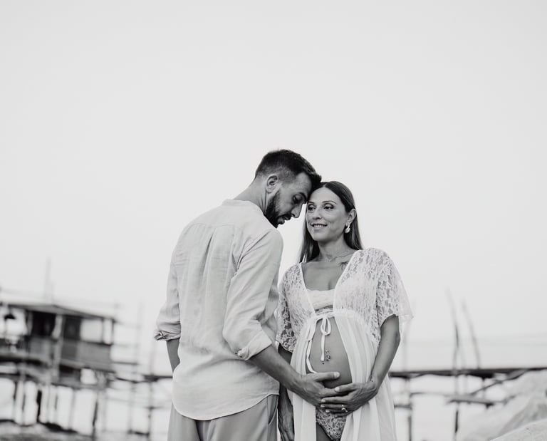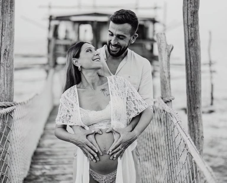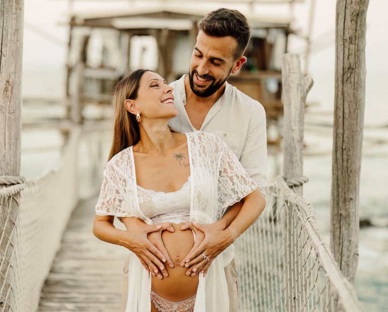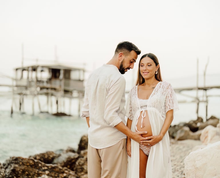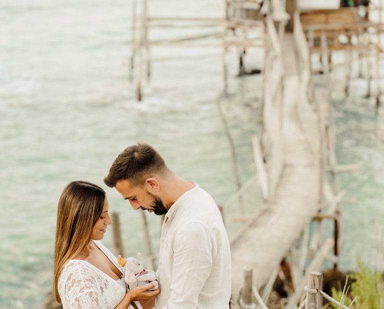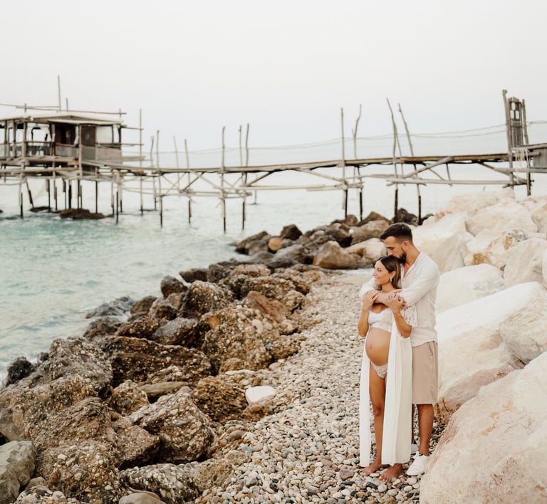 La sessione di maternità di Martina e Lorenzo è stata un'esperienza magica, immortalata tra le onde del mare e la suggestiva bellezza del trabocco abruzzese.